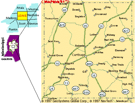 All pages, information there-on including all graphics, for the Leake County, Mississippi, web site are copyrighted, whether marked or not and that copyright is held by Bruce Reeves, unless otherwise indicated. The original MSGenWeb logo (state with magnoilia) was originally created by Ellen Pack (copyright 1997). The license plate MSGenWeb logo (see•kin) is copyrighted 1998 by the Mississippi GenWeb Project and was created by Debbie Gibbons. The map of Leake County used in the Leake County logo is copyrighted as indicated and is used according to their usage guidelines. The fan background used on the pages is NOT copyrighted but is in the public domain.