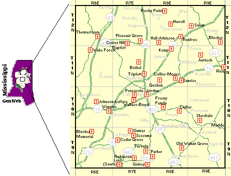 This map represents the cemeteries that have been transcribed at one point or another in Leake County. If you have any transcribed cemeteries you would like to see here, please send me the file. As I am able, they will be posted here and the map updated. Use the mouse to select a cemetery, or use the links below: